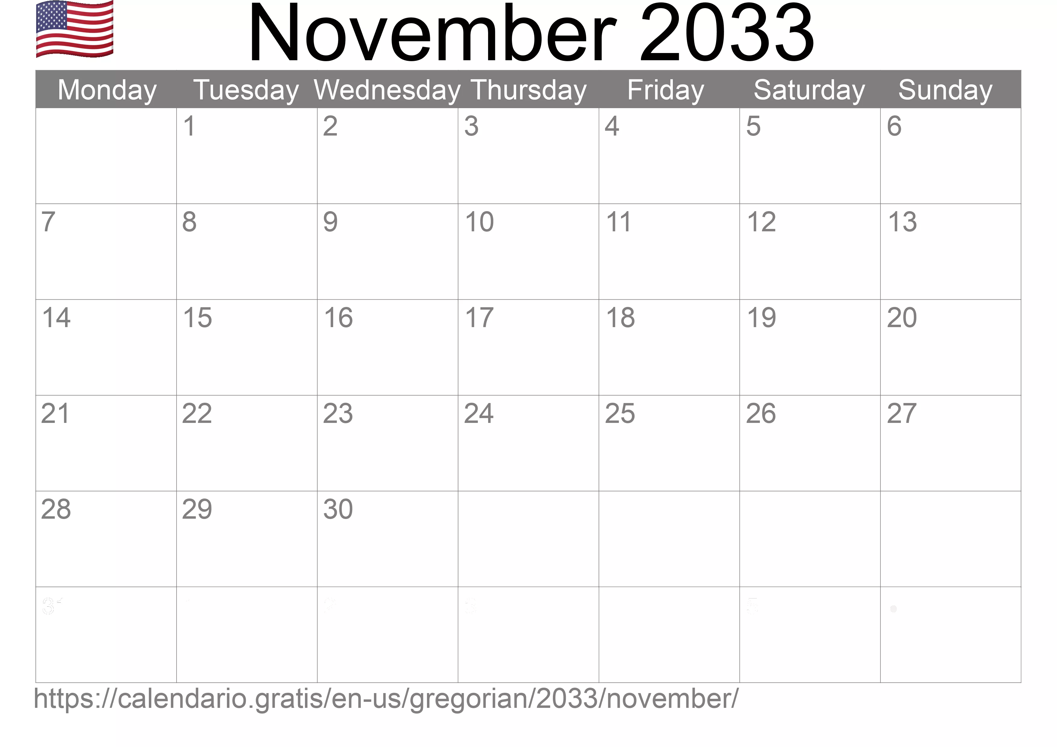 Monthly 2033 Calendar with Day Numbers WikiDates org