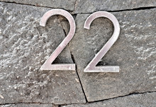 Number 22 twenty two golden metal address sign fixed onto textured