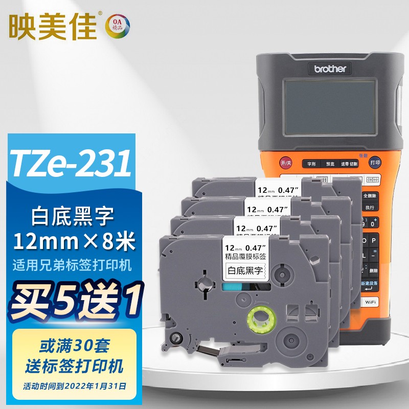 映美佳标签机色带12mm白底黑字TZe 231(4支装) 适用兄弟brother不干胶标签纸PT D210 450 600 E550W