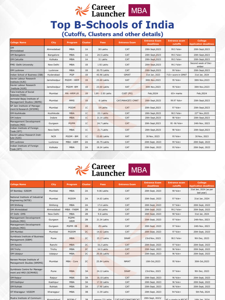 Top B Schools of India Clusters Cutoffs Fees PDF Master Of
