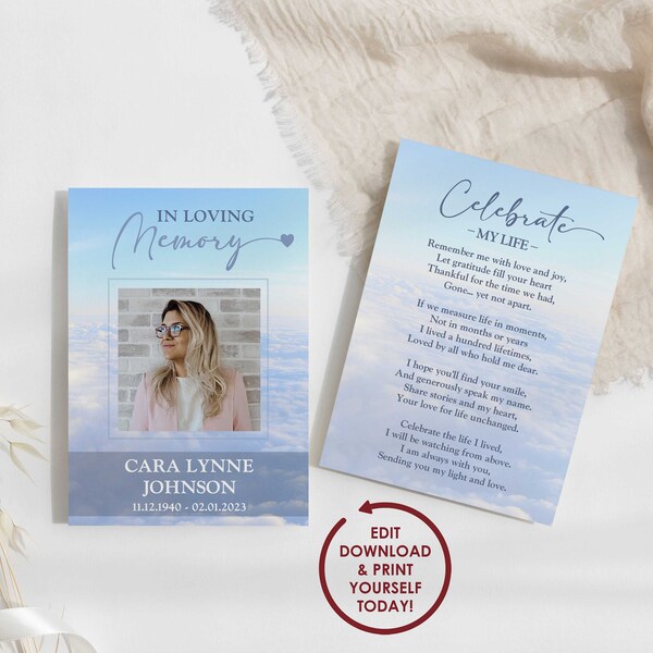DIY EDITABLE Heavenly Clouds Memorial Card Template Blue Sky Funeral
