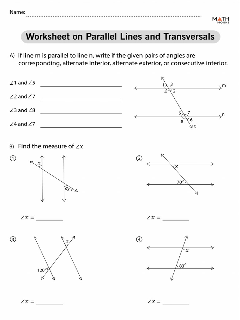 Parallel Lines and Transversals Worksheets Math Monks