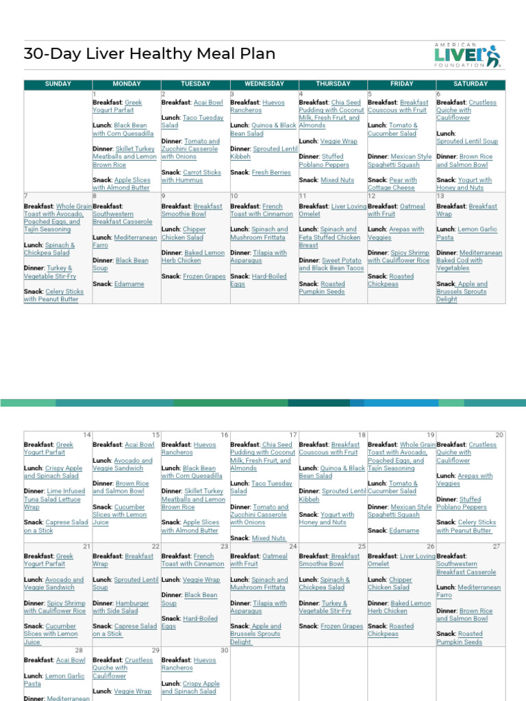 30 Day Meal Calendar PDF Lunch Salad