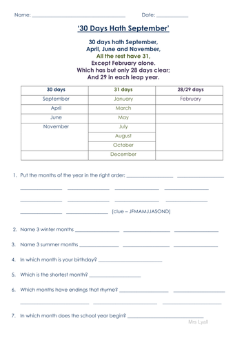 Free quot Thirty Days Has September quot Poem Activity Sheet Printable Poem