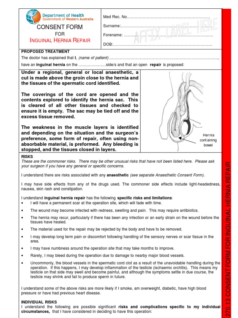 Consent Form for Inguinal Hernia Repair Outlining Procedure Details