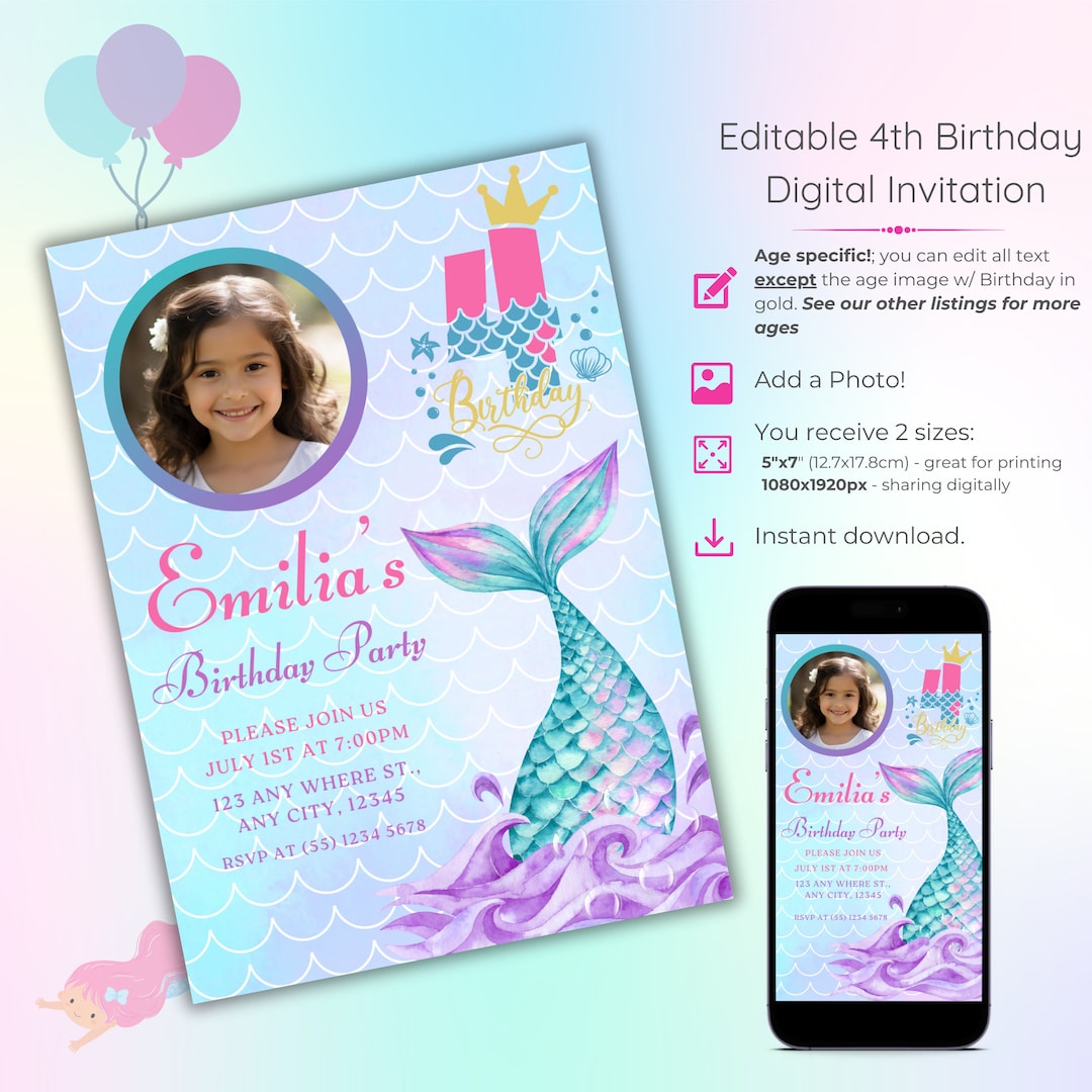 Mermaid 4th Birthday Invitation Template With Photo Editable Colorful