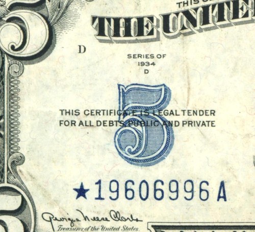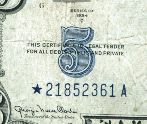 ((ERROR GAS PUMP DIGIT)) $5 1934 Silver Certificate ** DAILY CURRENCY