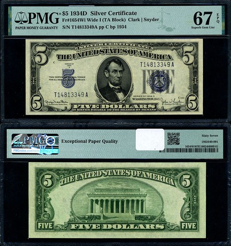 FR 1654 WI $5 1934 Silver Certificate Wide I T A Block Superb Gem PMG