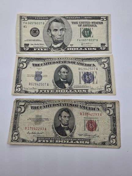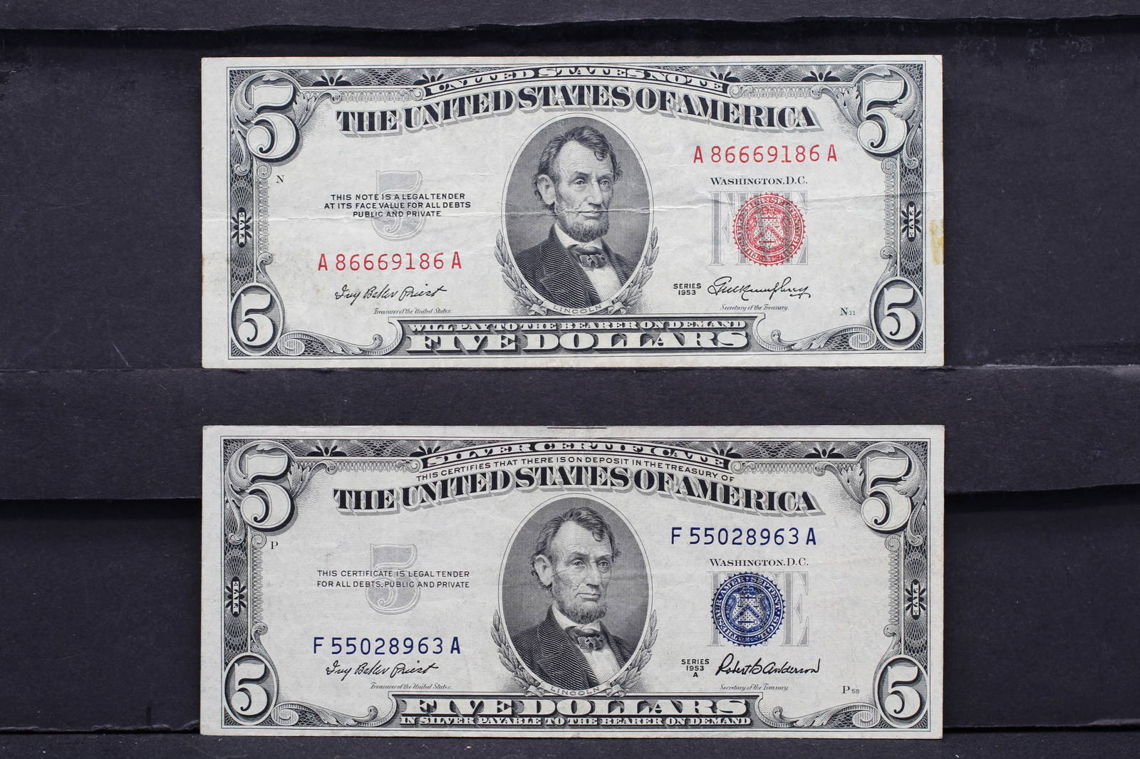 1953 a Blue Sal $5 Silver Certificate 1953 Red Seal $5 Note Auction