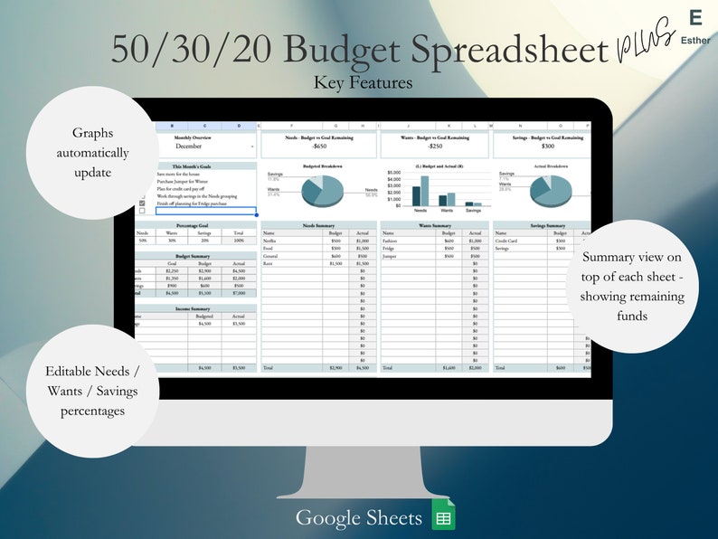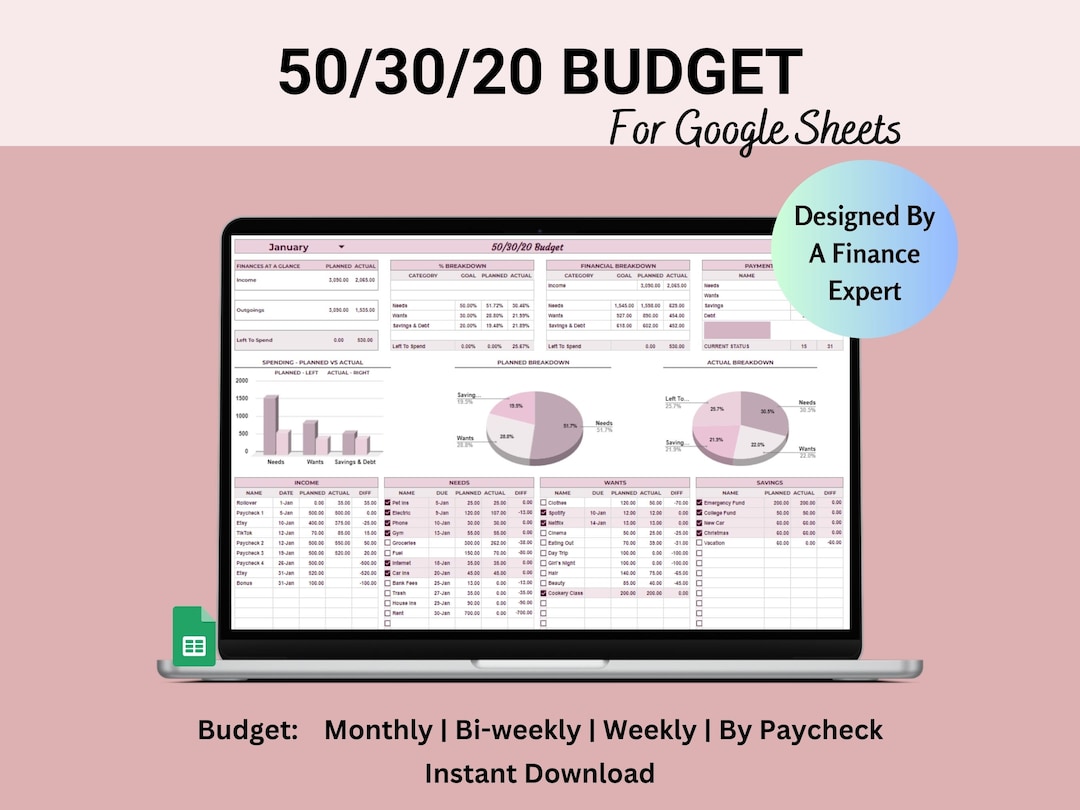 50/30/20 Monthly Budget Google Sheet Template Spreadsheet Etsy