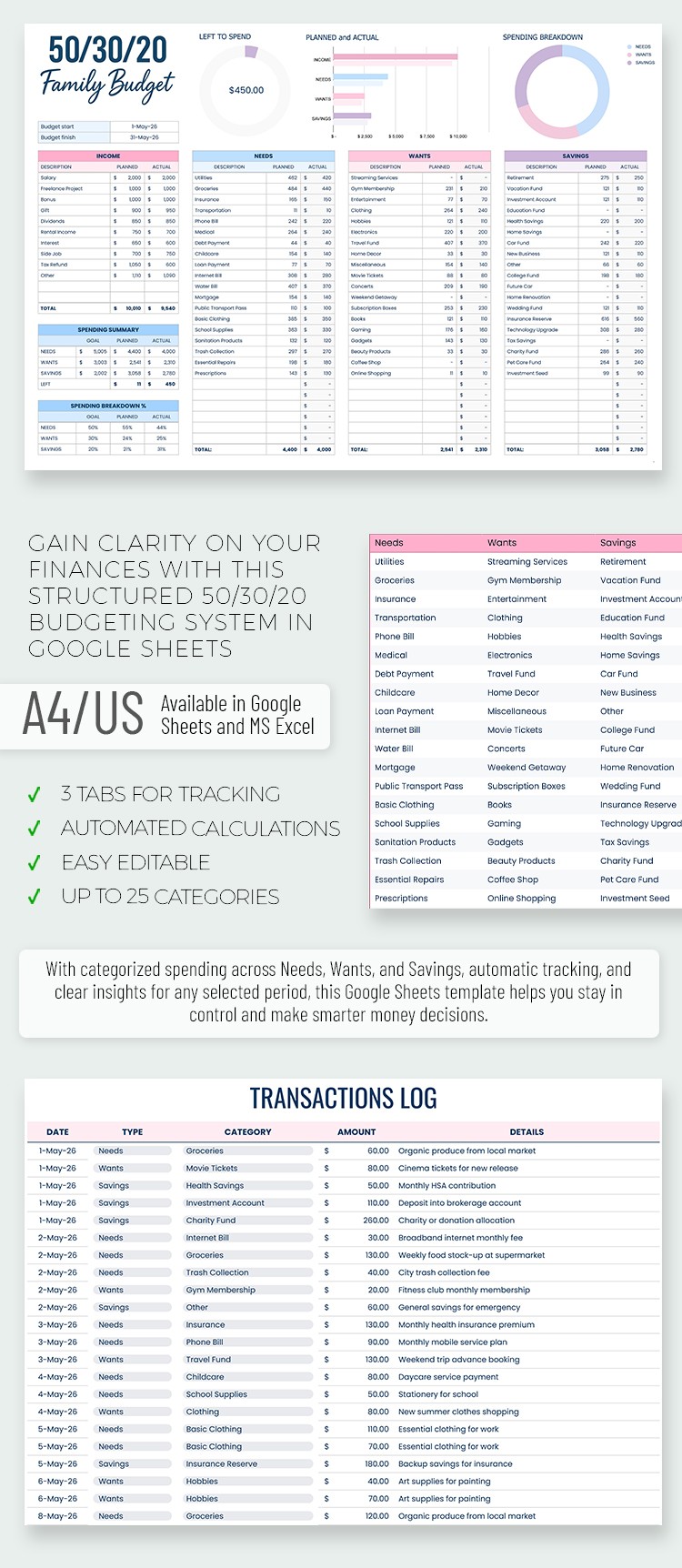 Free 50/30/20 Family Budget Planner Template in Google Sheets and