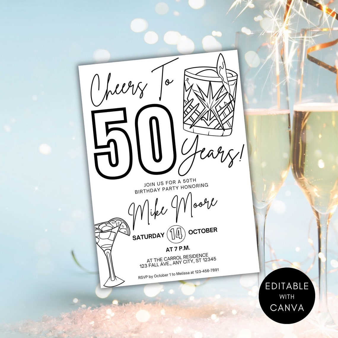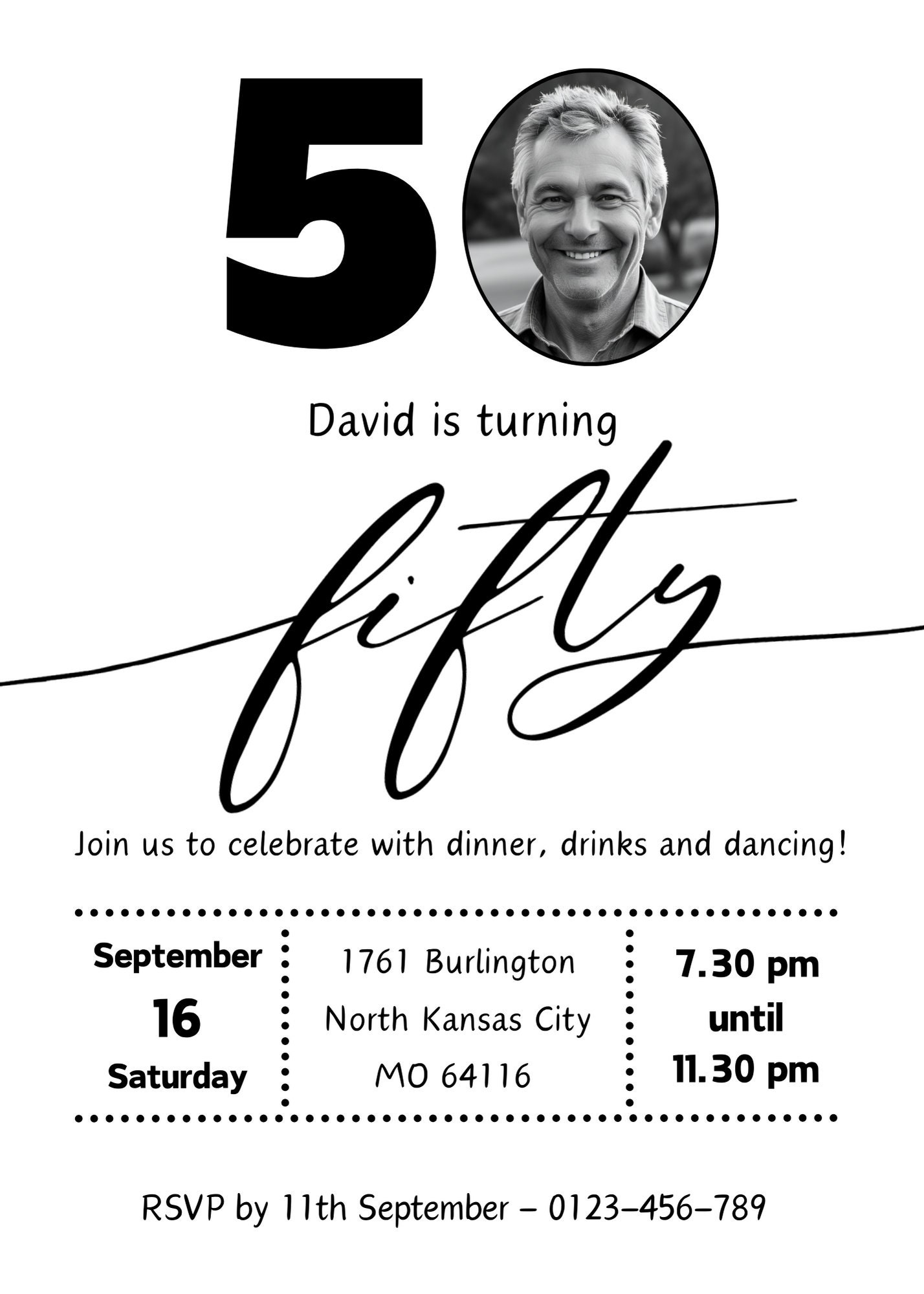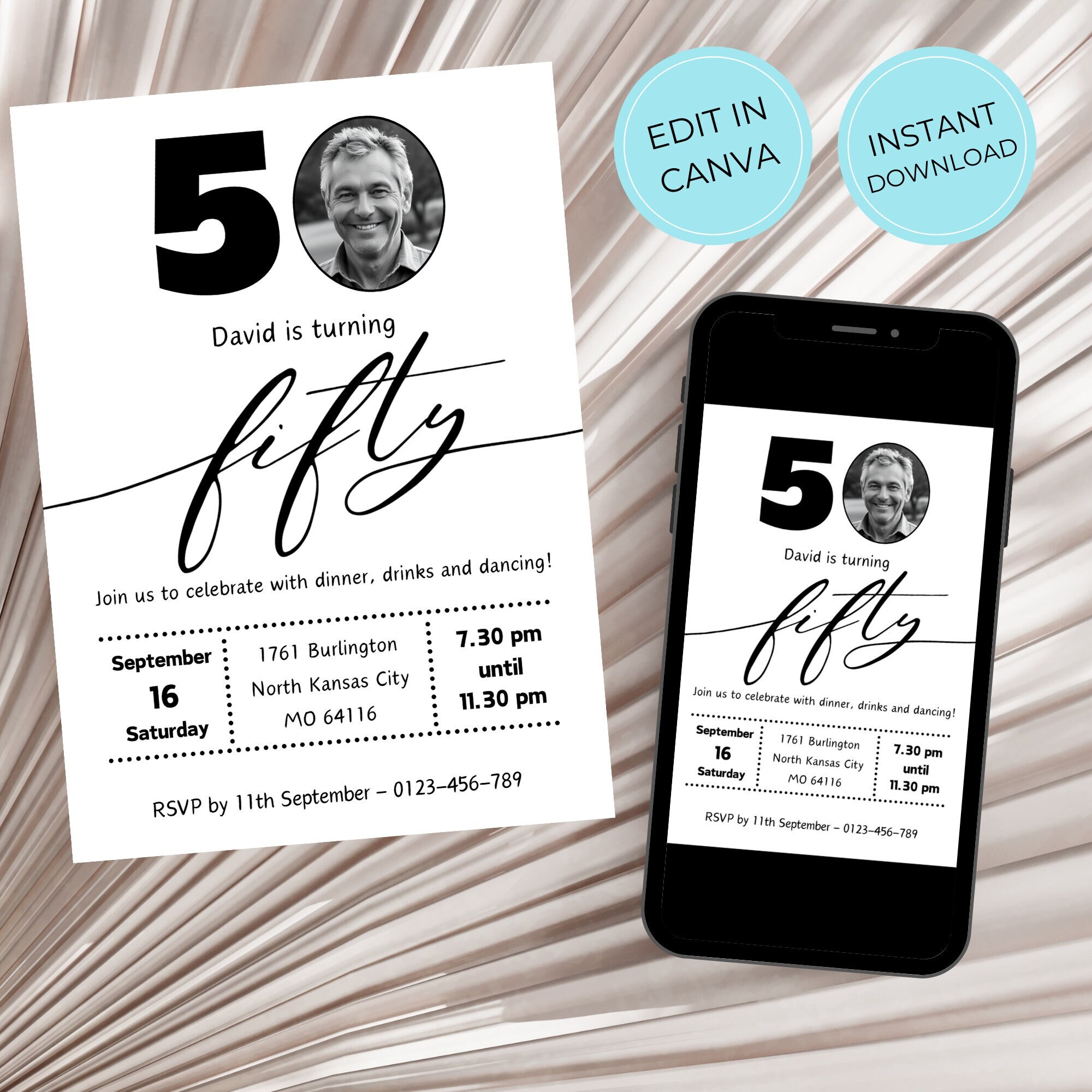 50th Birthday Invitation Digital Template for Him Male Black White