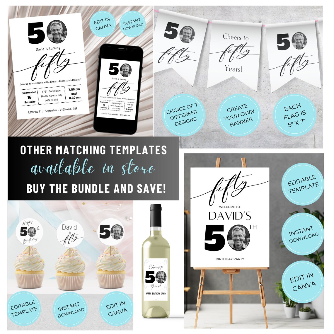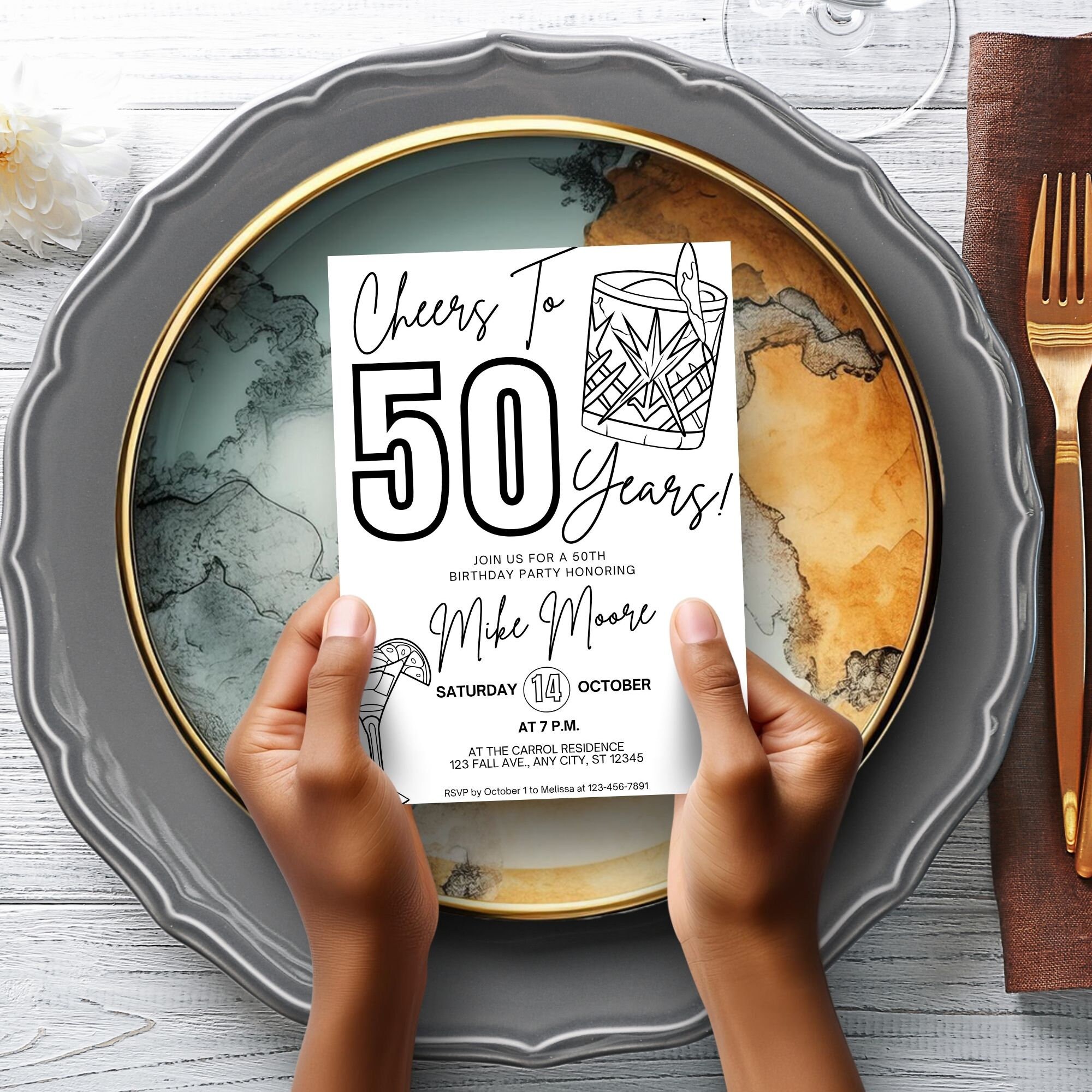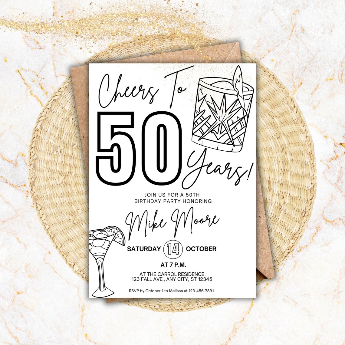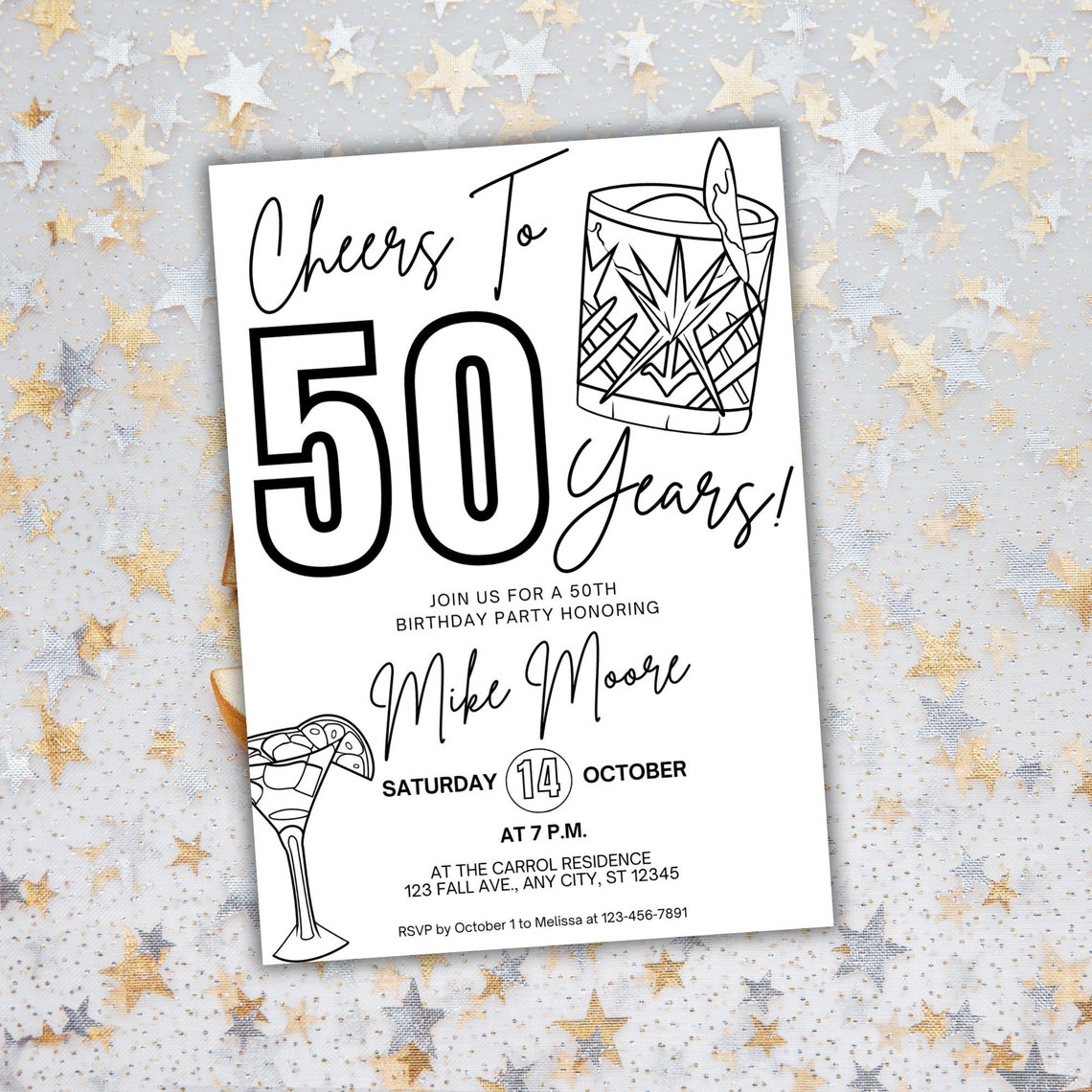 50th Birthday Invitation Digital Template for Him Male Black White