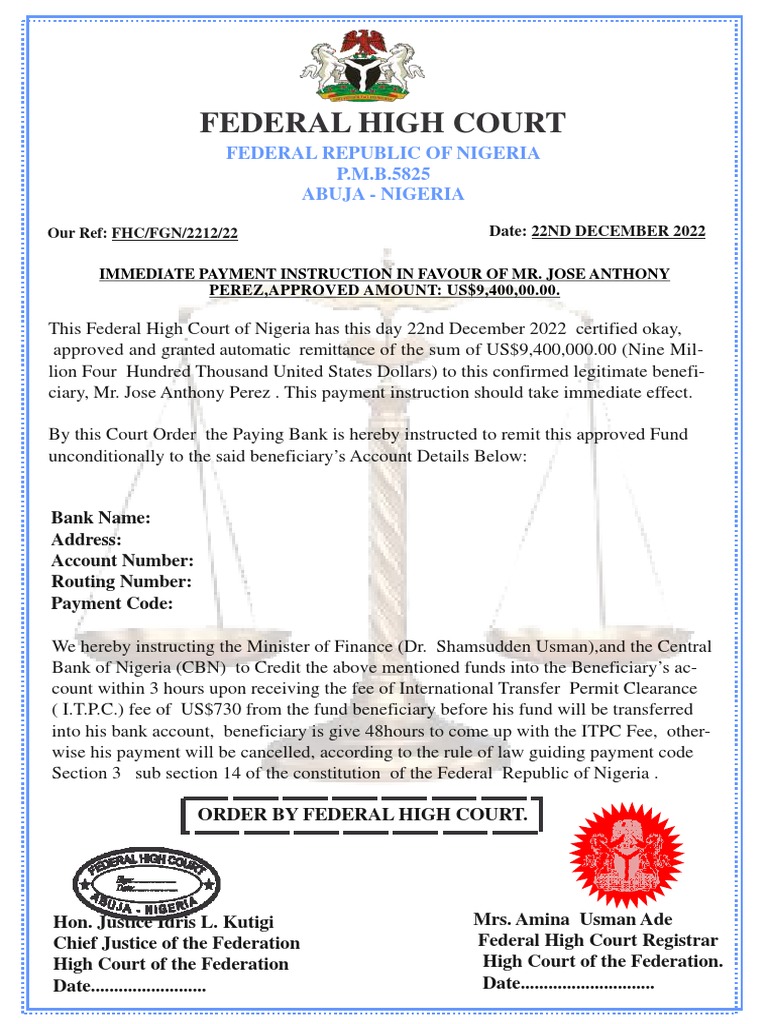 Federal High Court: Federal Republic of Nigeria P M B 5825 Abuja