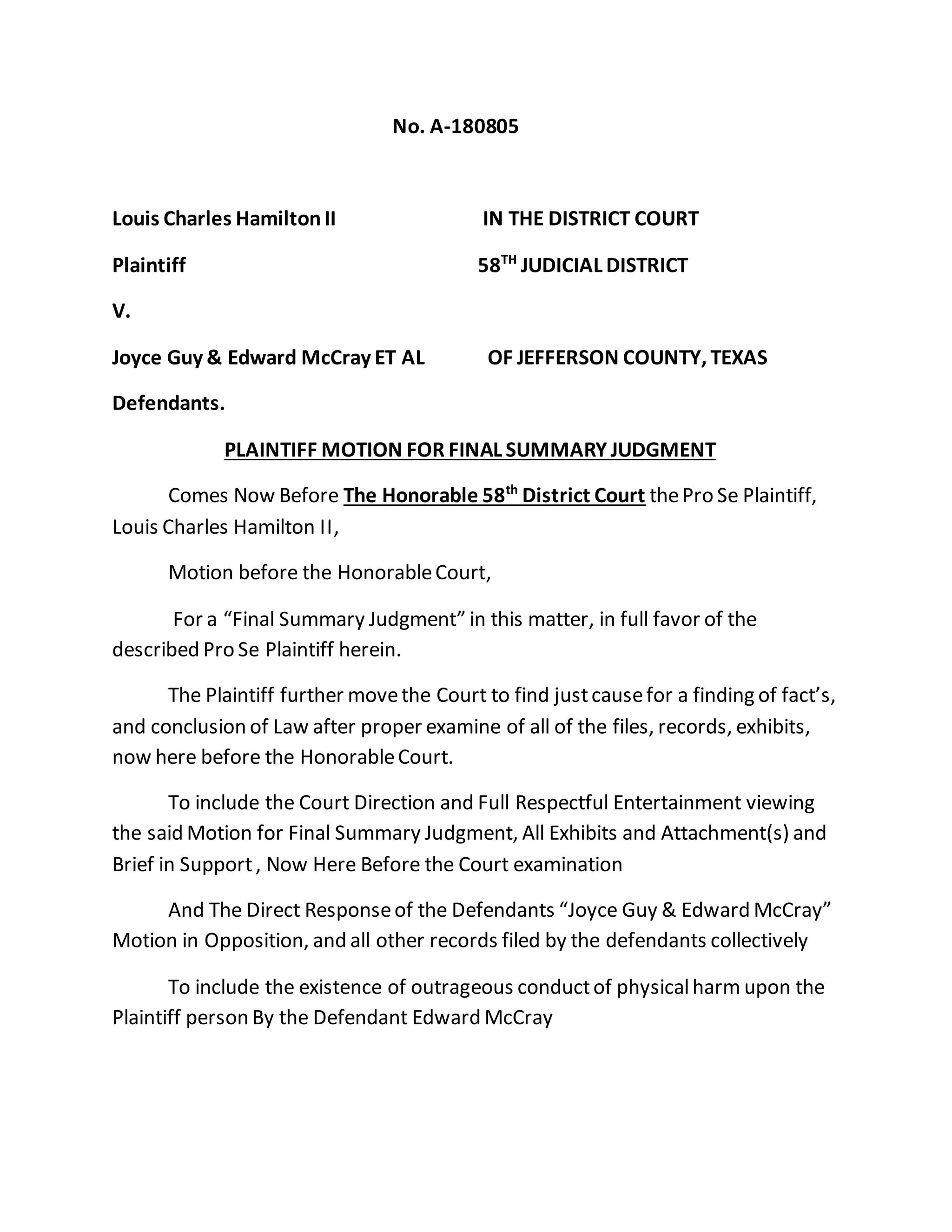 Louis Charles Hamilton II PLAINTIFF MOTION FOR WRIT OF ATTACHMENT No A