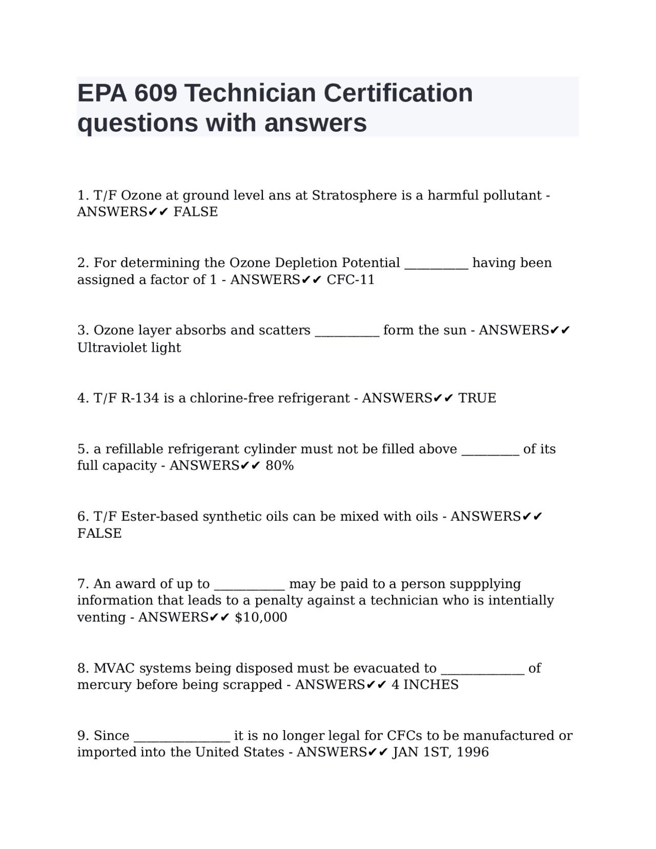 EPA 609 Technician Certification Questions With Complete Solutions