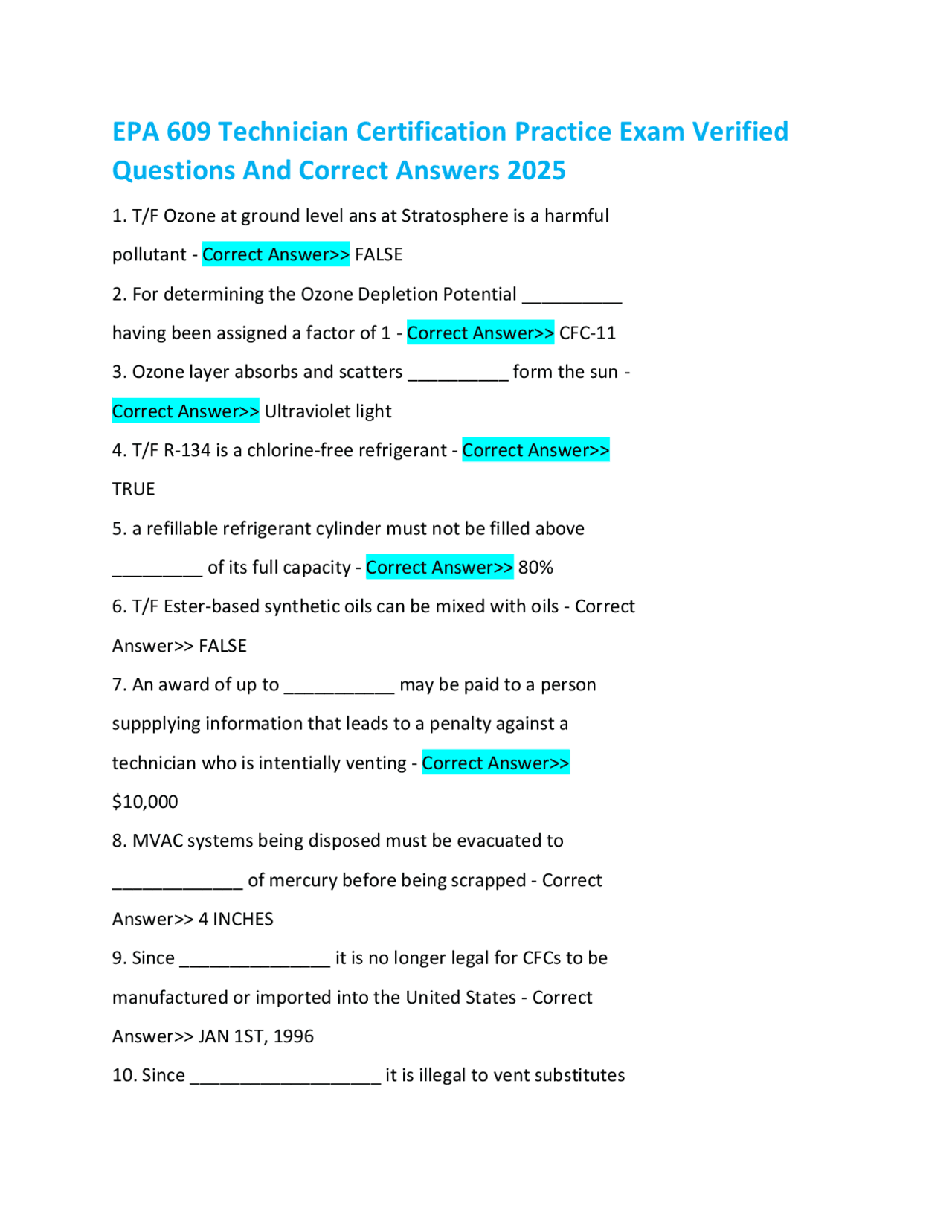 EPA 609 Technician Certification Exam Questions with Verified Answers