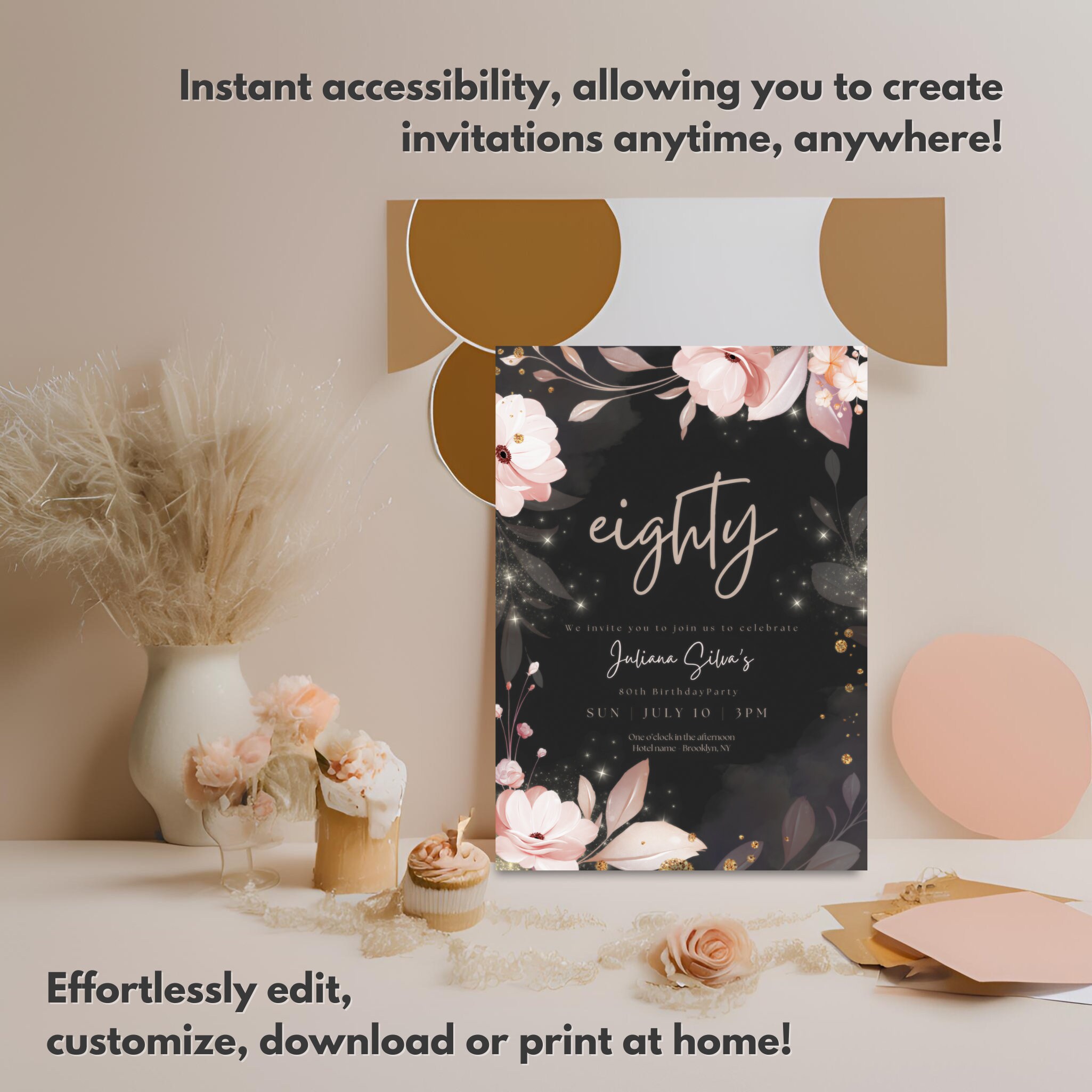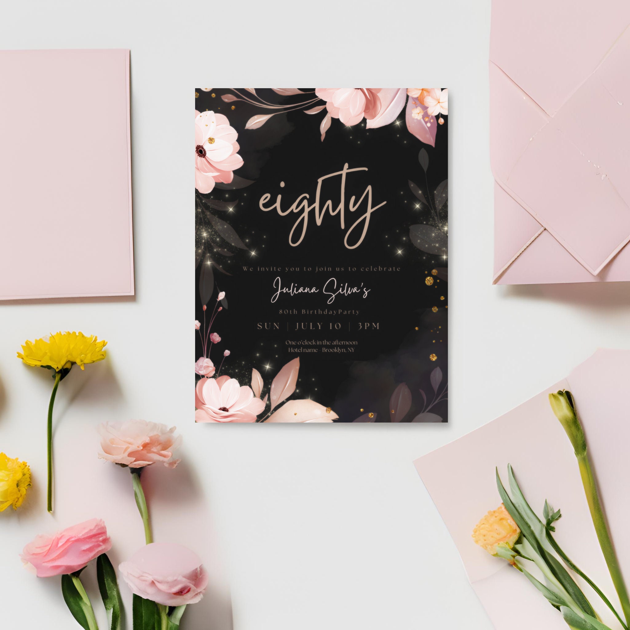 Editable 80th Birthday Invitation Template Flowers Black and Gold