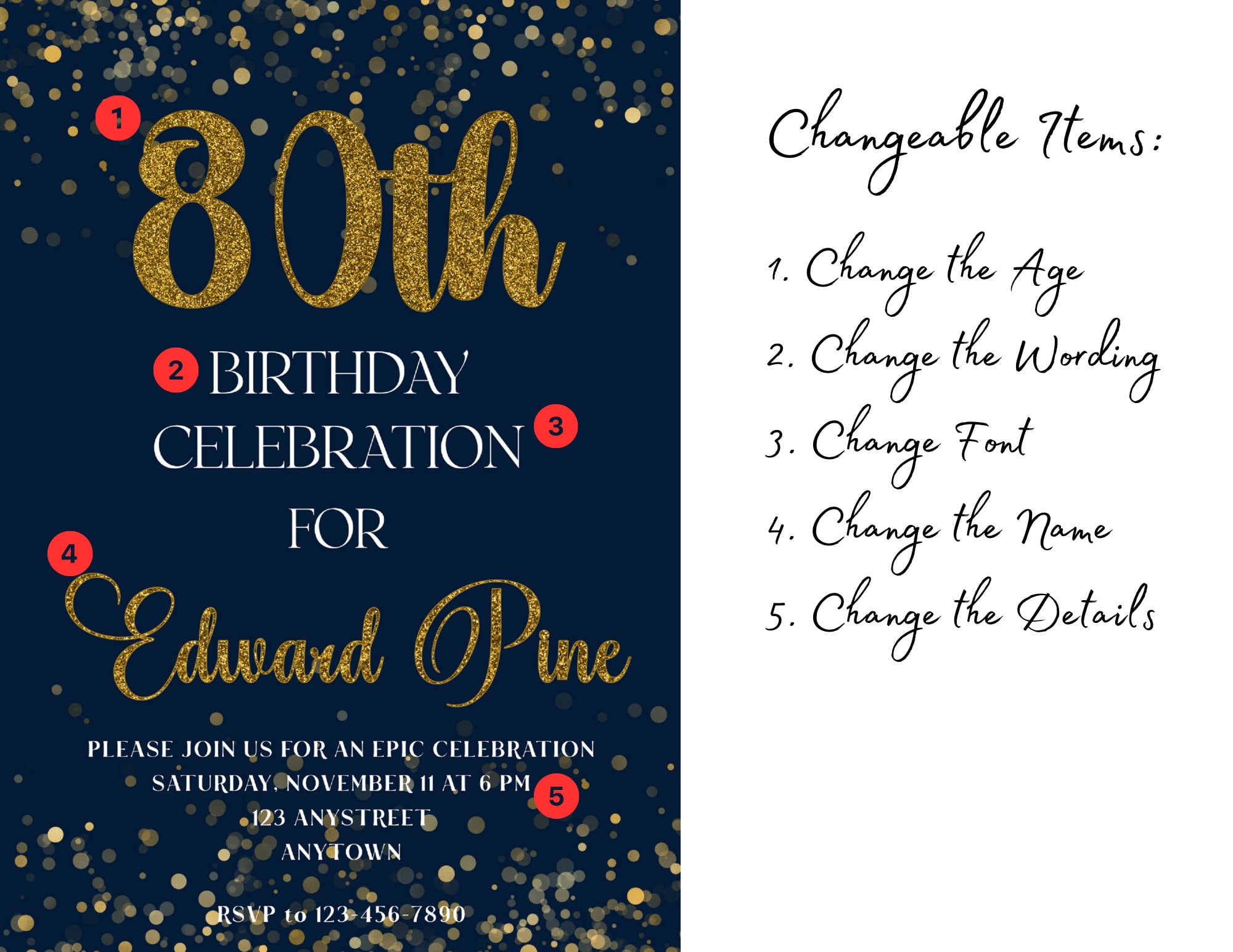 Editable 80th Birthday Invitation Digital Template Eighty Etsy