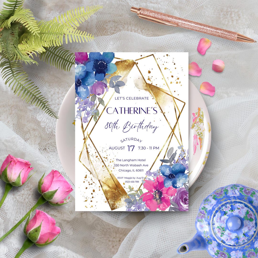 Printable 80th Birthday Party Invitation Digital Template Watercolor