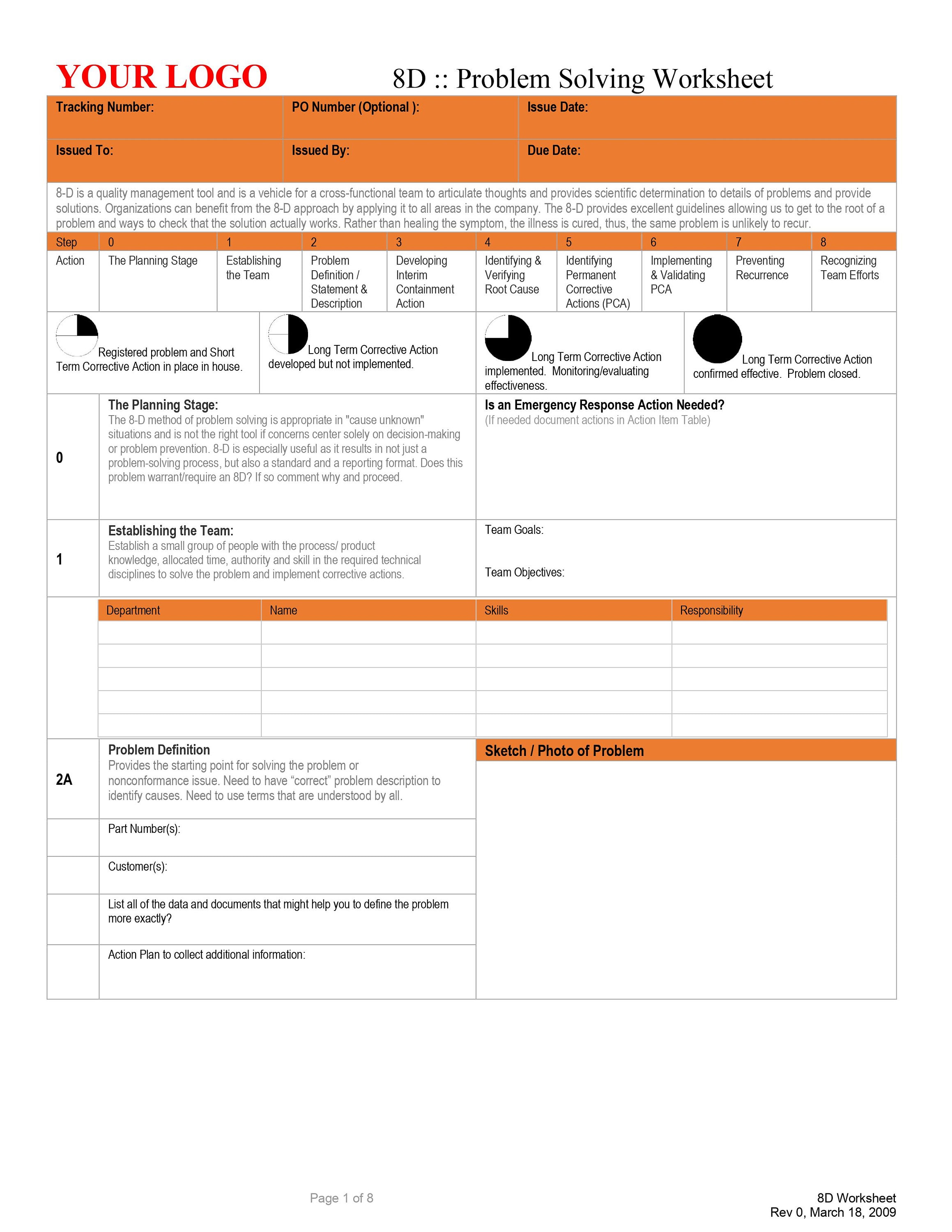8D Problem Solving Template Root Cause Analysis Work Sheet