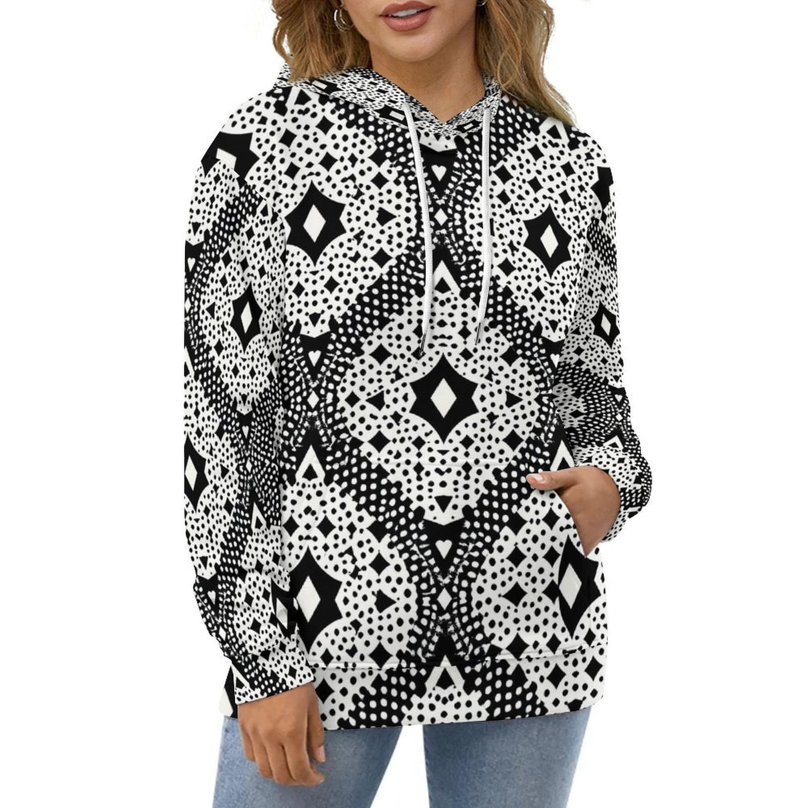 Casual Hoodies Black White Pattern Lady Long Sleeve Classic Design