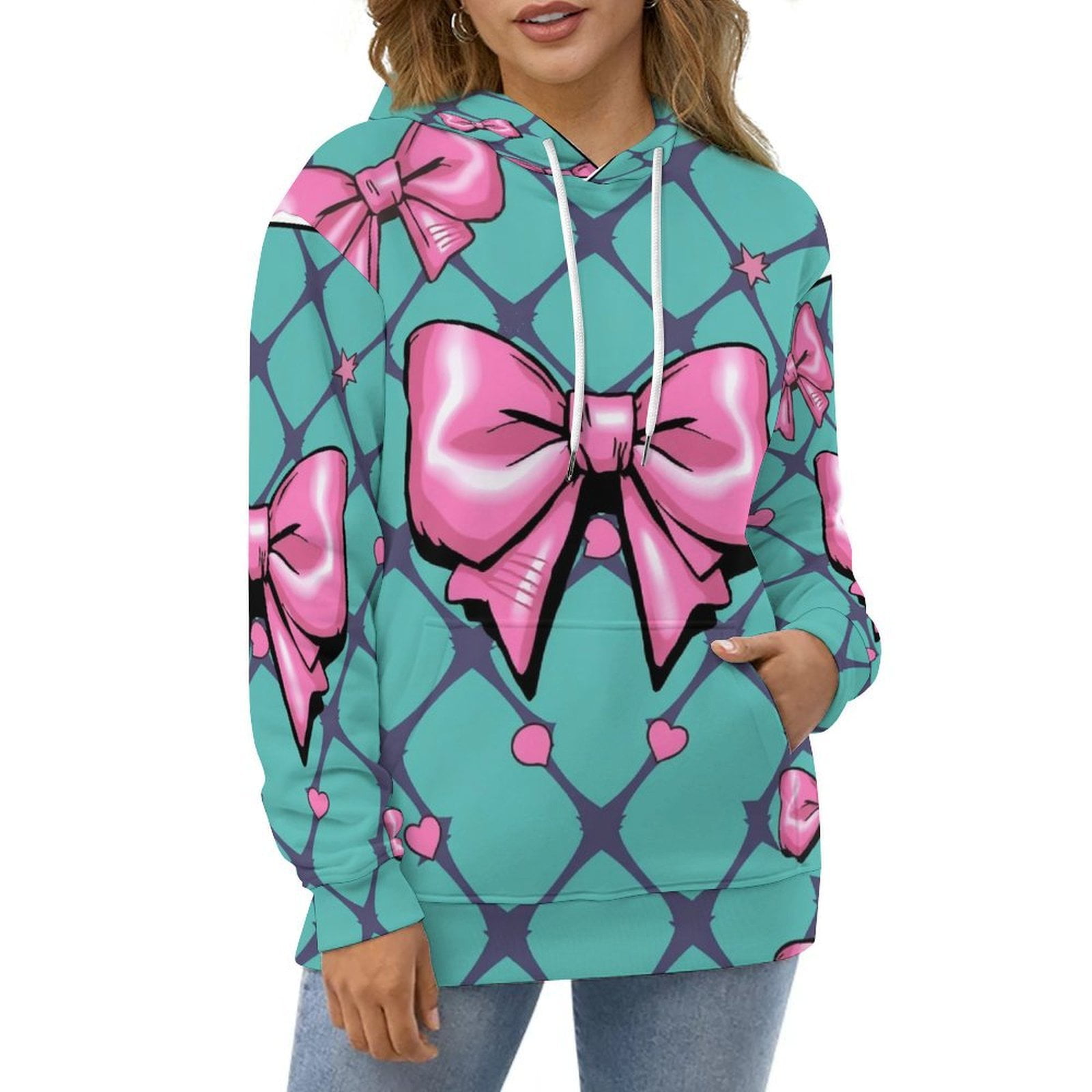 Casual Hoodies Pink Bows Teal Background Lady Long Sleeve Classic
