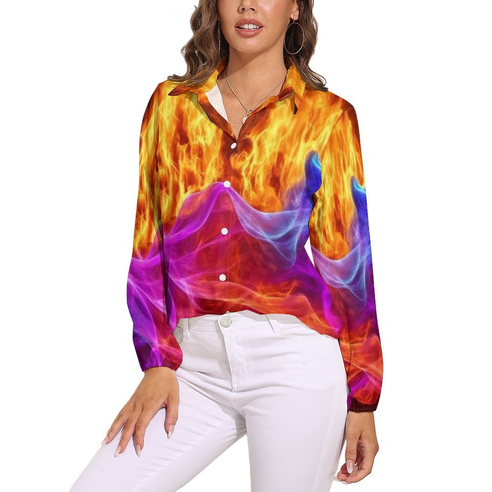 Colorful Flame Fusion Art Vntage Casual Long Sleeve Shirt Blouse Woman