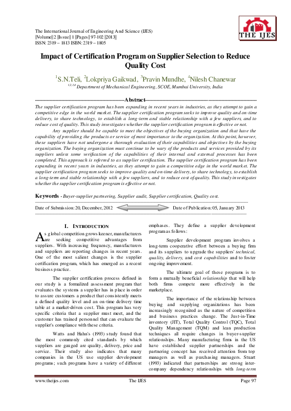 (PDF) Impact of Certification Program on Supplier Selection to Reduce