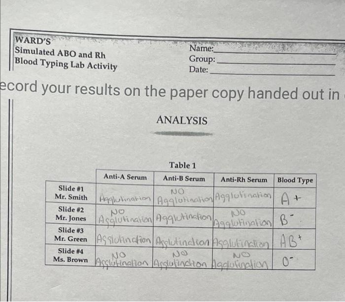 Simulated ABO and Rh Blood Typing Lab Procedure and Results Course Hero