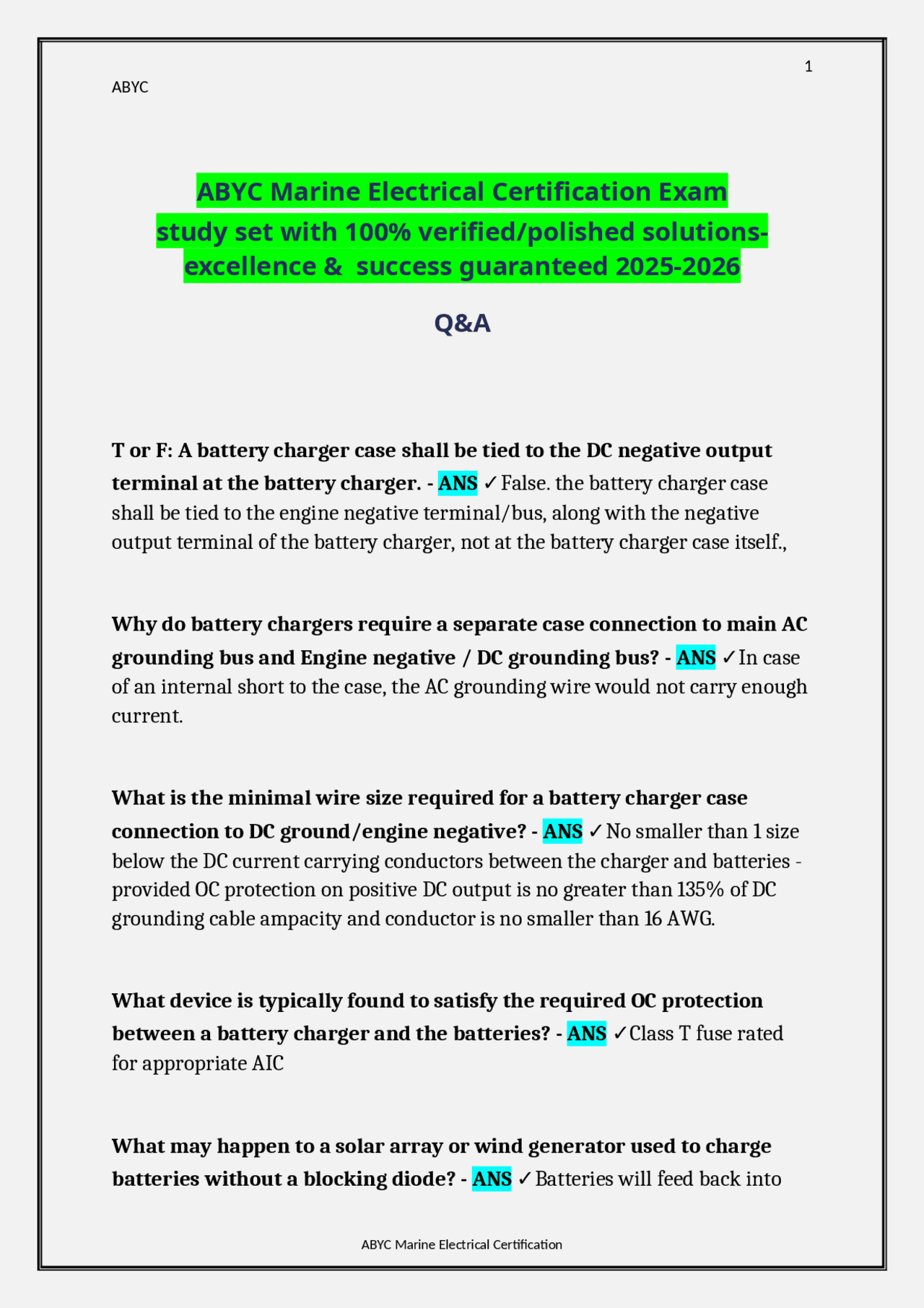 ABYC Marine Electrical Exam Questions Answers 100% Accurate ABYC