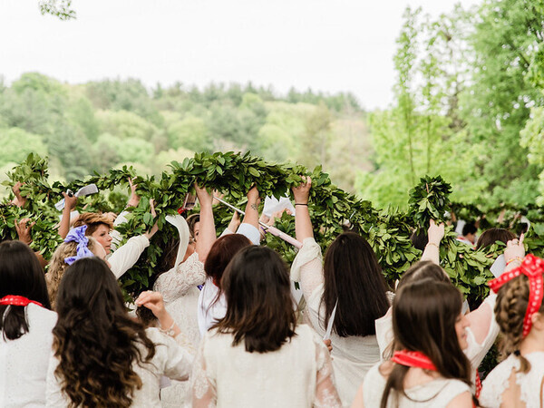 A group of senior students at Mount Holyoke College are seen marching