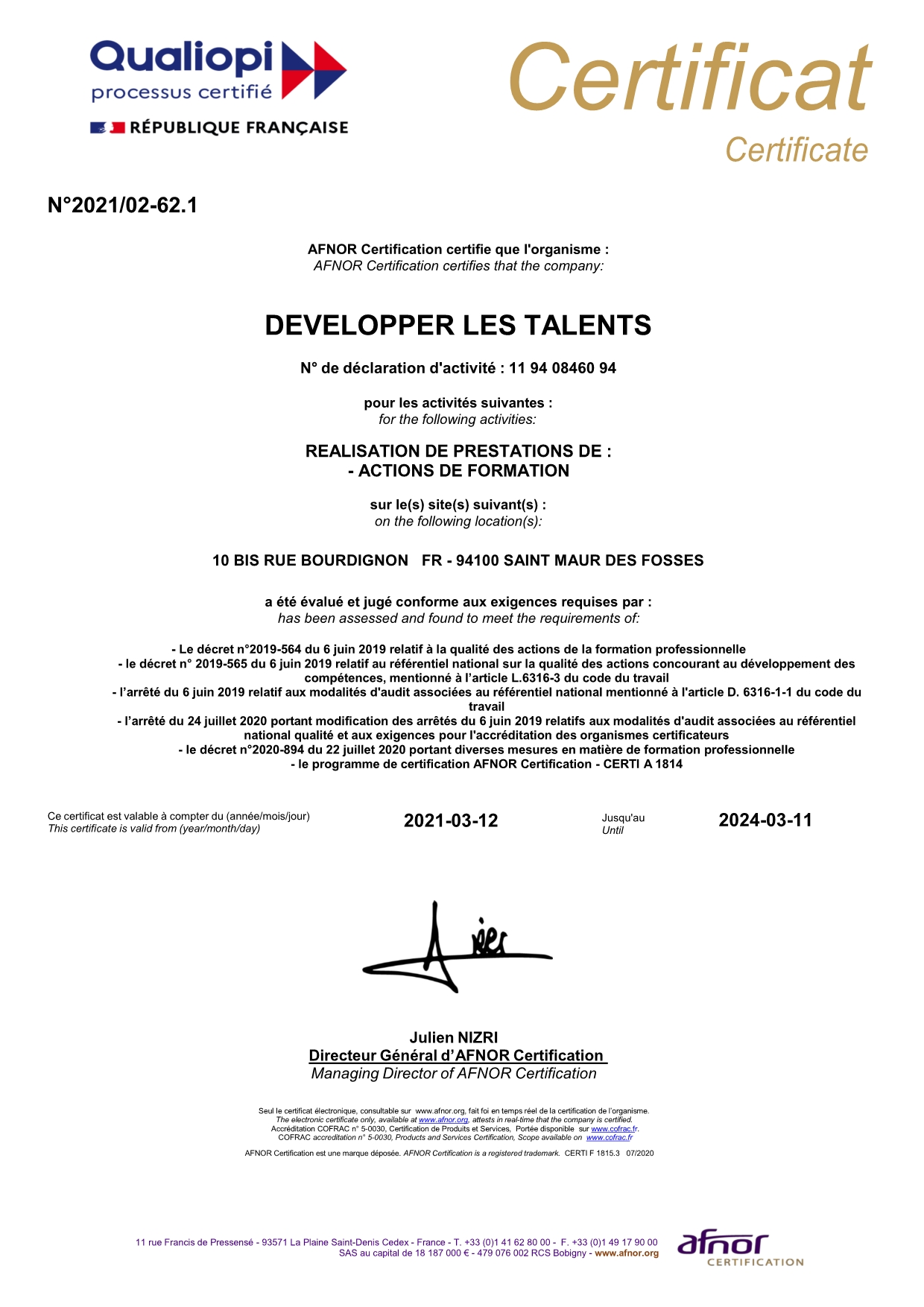 Certificat Qualiopi Développer les talents : Accompagnement des