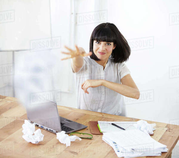 Upset throwing paper and portrait of business woman at her desk with