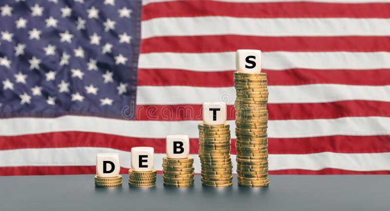 Dice Form the Word Debts on Top of Coin Stacks Stock Photo Image of