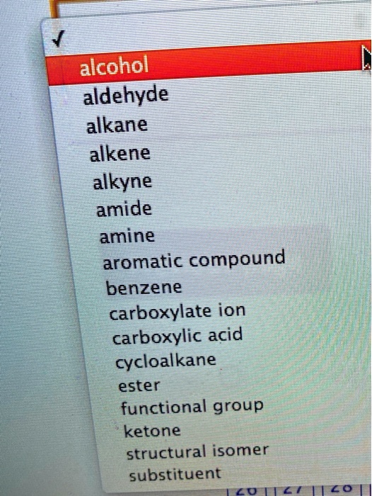 SOLVED: alcohol aldehyde alkane alkene alkyne amide amine aromatic