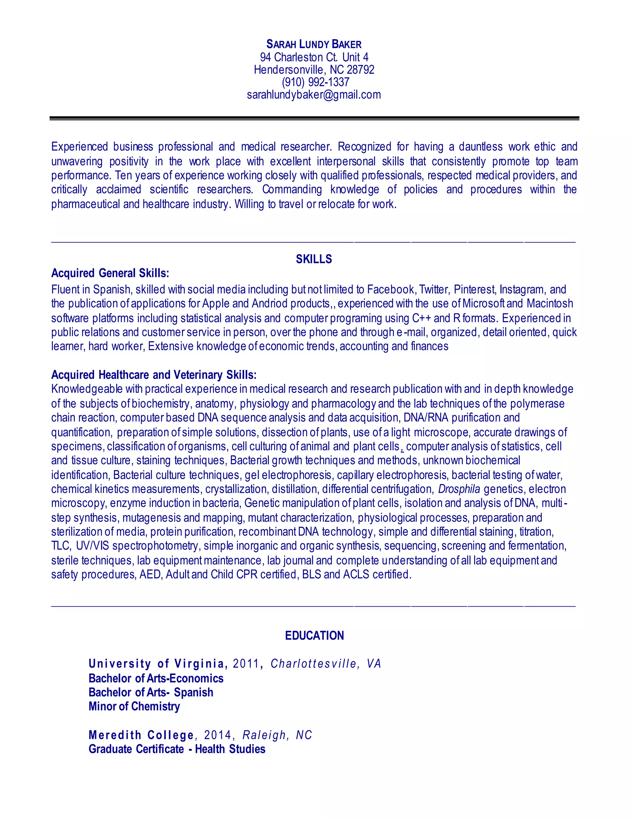 SarahLBaker Resume 2017 DOCX Chemistry Science
