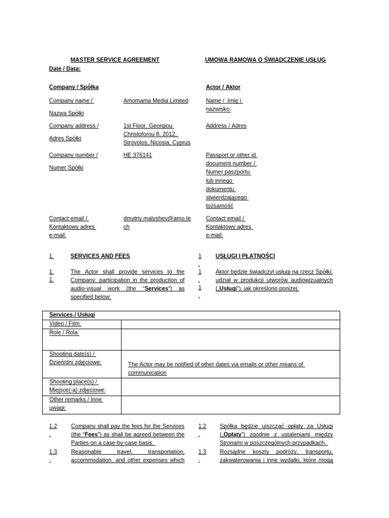Template Actor Agreement Adults Eng PL Joanna Krol PDF