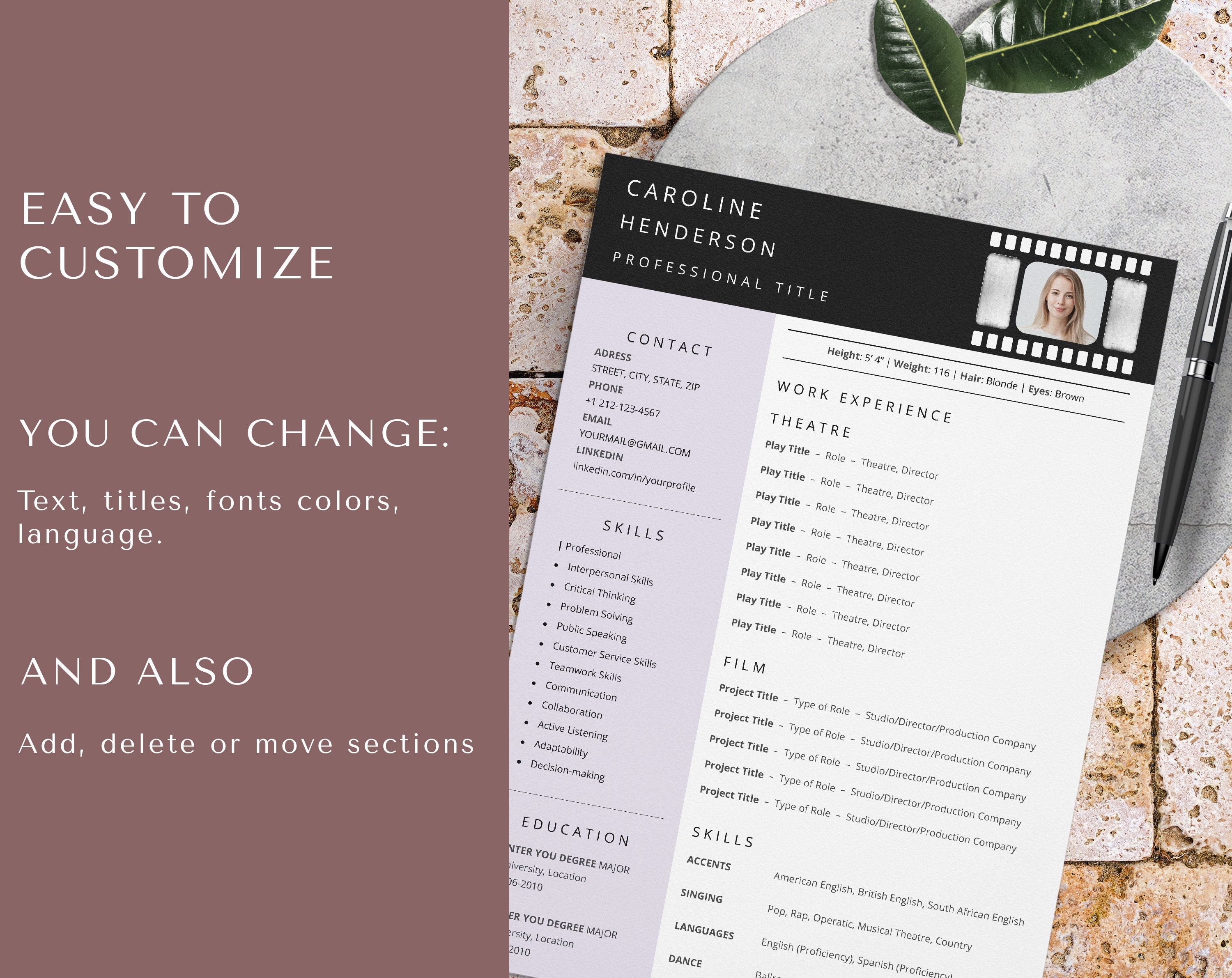 Acting Resume Template Editable in MS Word or Pages Actor Resume