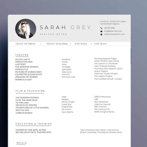 Actor Resume Template / 8 X 10 Acting Resume / Instant Digital Download