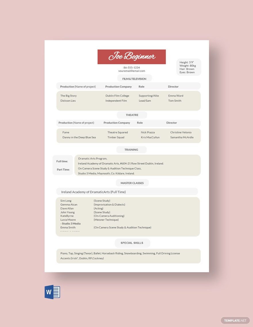 Resume for Actors Auditions CV Template MS Word Acting Same Size
