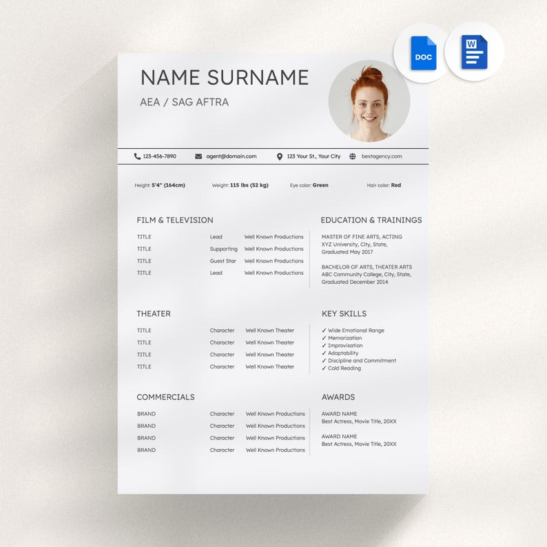 Gratuita Plantilla de Currículum para Actores para Google Docs