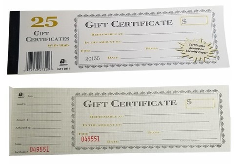 Adams Gift Certificate Book Single Paper 25 Numbered Certificates per