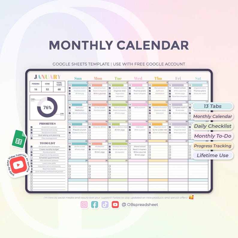 Monthly Calendar Template To do List for Google Sheets ( Checklist