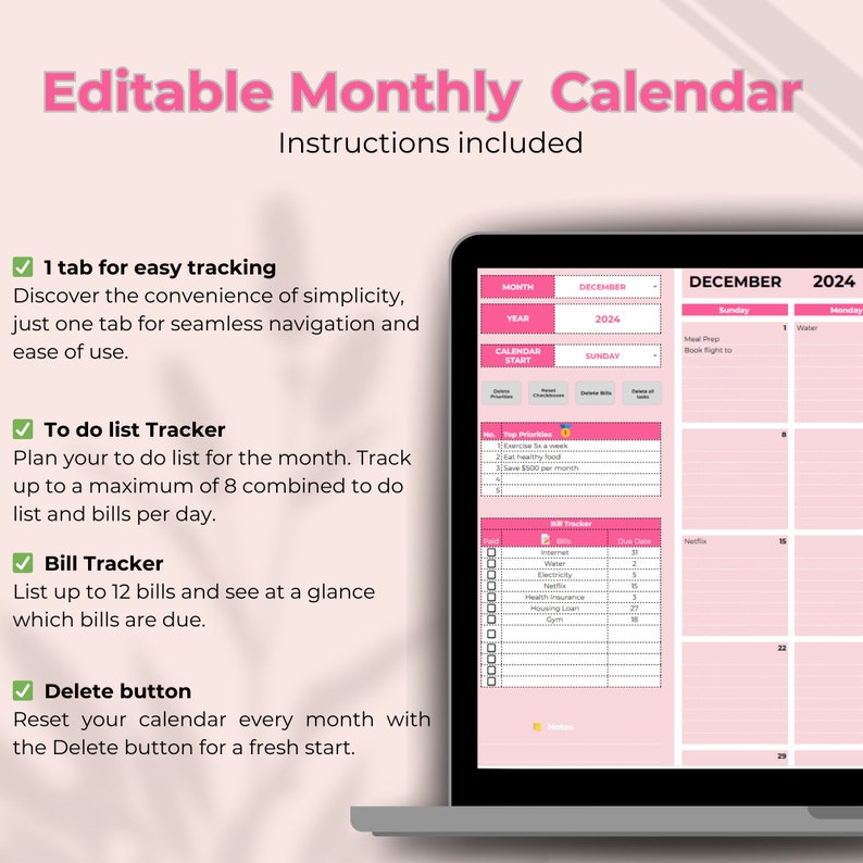 Editable Monthly Calendar Bill Tracker Bill Calendar Task Tracker to Do