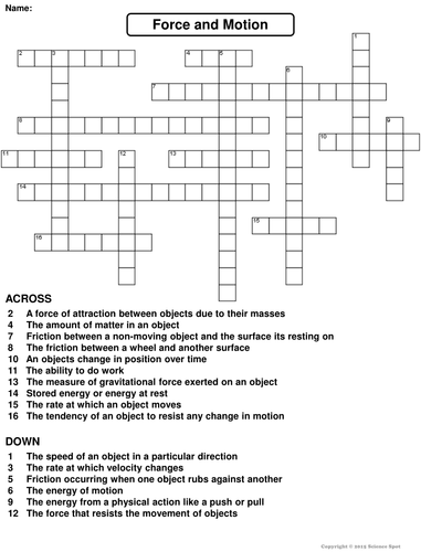 Force and Motion Crossword Puzzle Teaching Resources