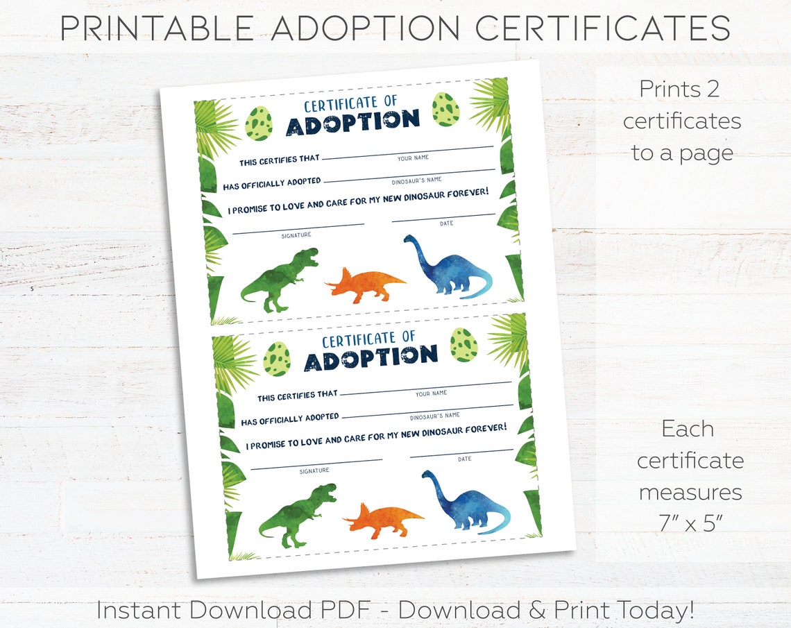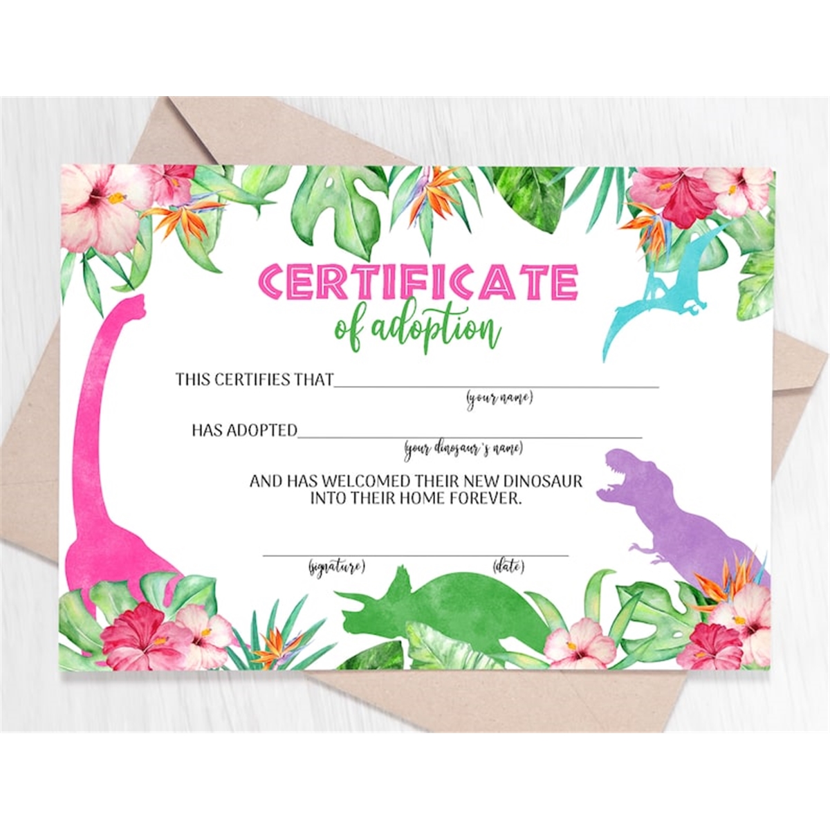 Printable Dinosaur Adoption Certificate Instant Download Dinosaur