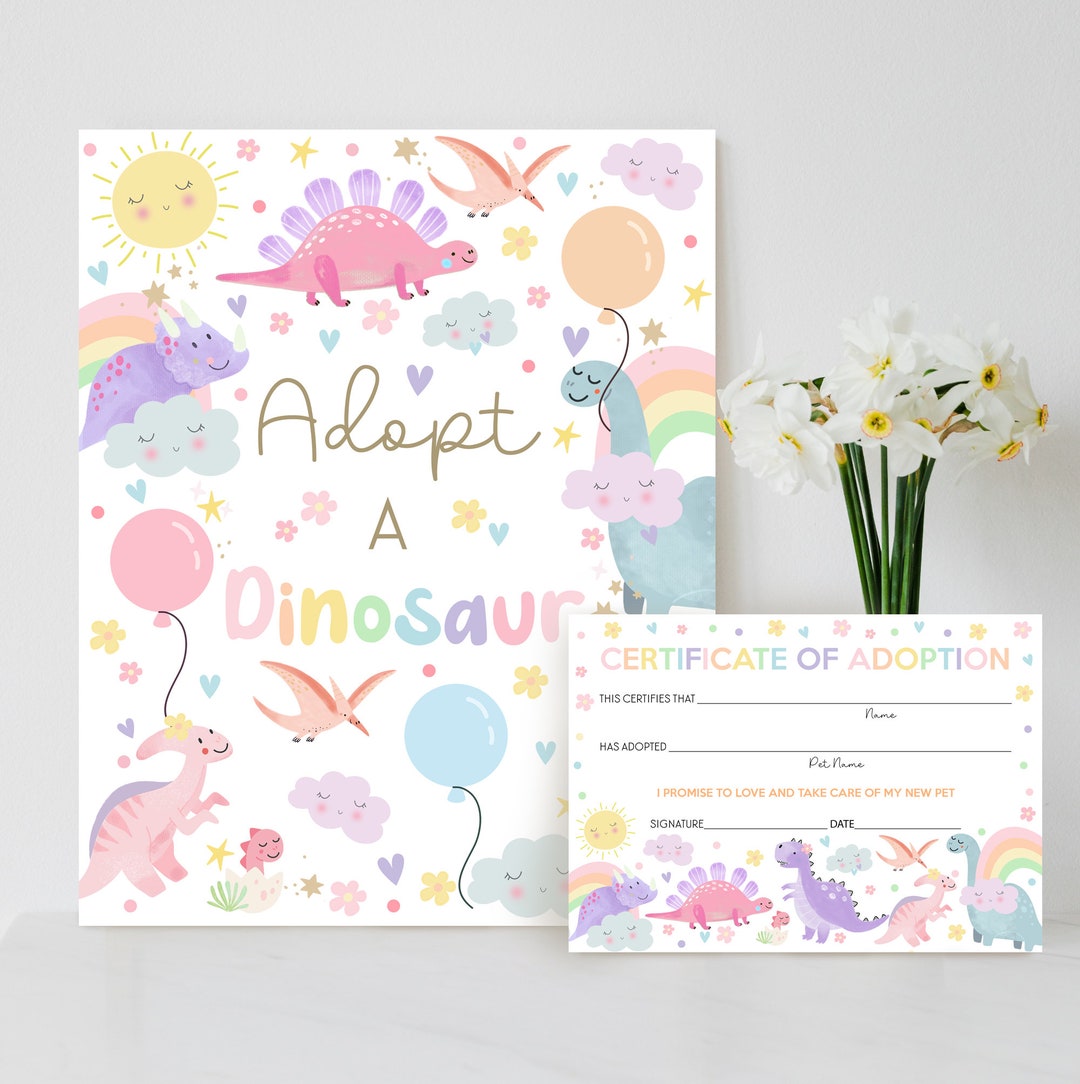 Pastel Dinosaur Adoption Sign Girl Dino Birthday Party Activity Adopt a