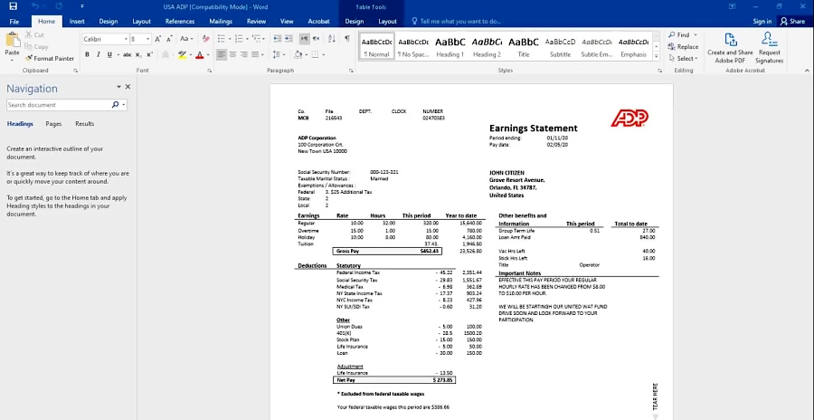 fake ADP earnings statement download Word and PDF template download