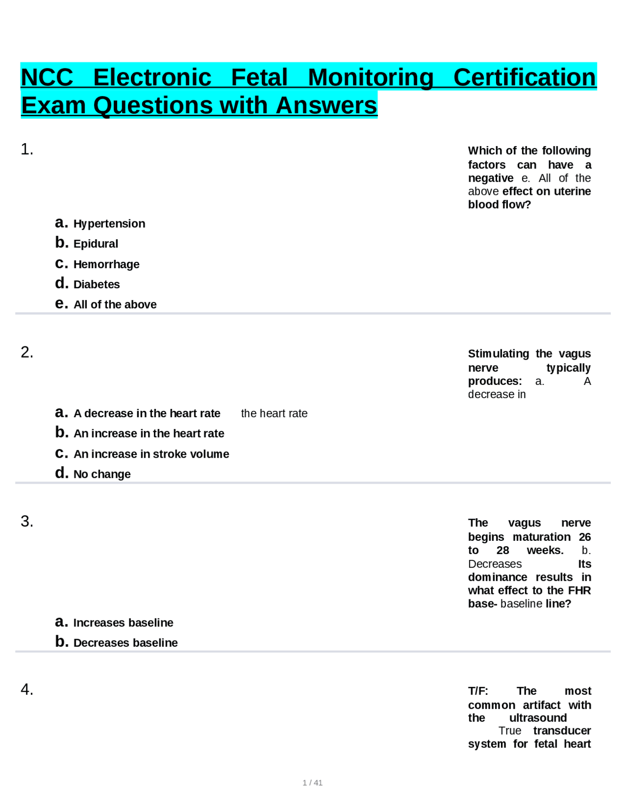 NCC Electronic Fetal Monitoring Certification Exam Questions with